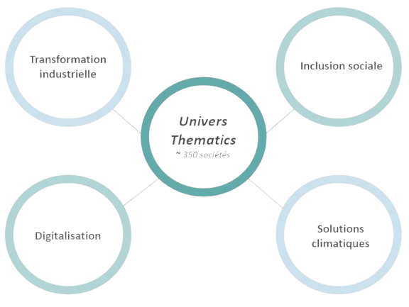 • Gestion active de conviction qui sélectionne des entreprises durables et de qualité répondant à 4 grands piliers thématiques.